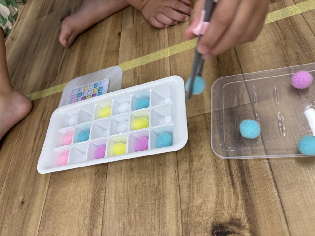 このお楽しみは製氷皿にデコレーションボールをお箸やトングで入れるのですが、見本のように同じ場所に入れたり全部移動させたりと楽しみながら行っていますよ🟣🥢