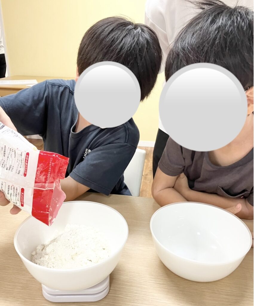 バター、砂糖、卵、薄力粉と、材料ごとに担当を決めて、